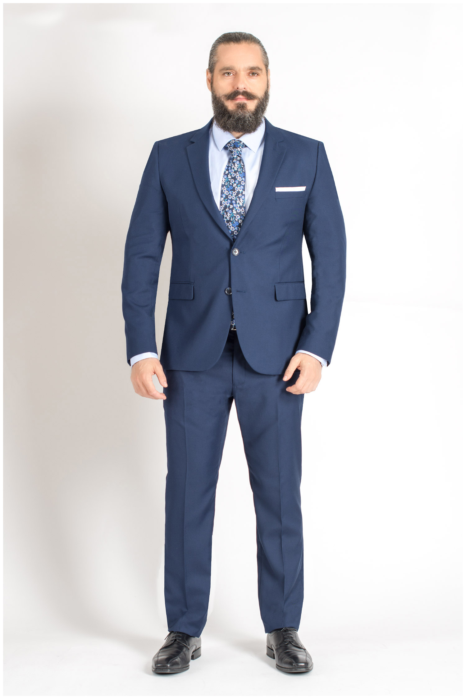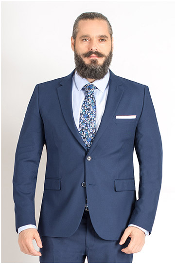 Traje de una fila con dos botones y dos aberturas. Slim fit. Tejido liso.